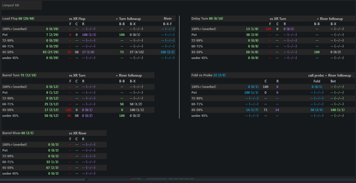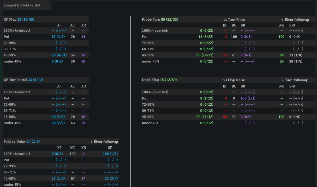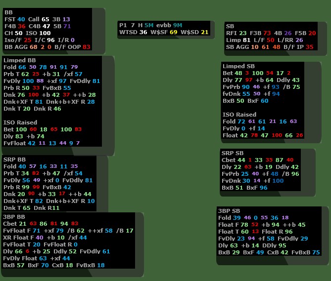 RangeSniper Heads-Up HUD – Pro-level HU poker HUD with 9 movable panels and 600+ custom stats for SB/BB. Covers SRP, limp, ISO, 3bet spots. Includes 27 merged popups by sizing. Color-coded: green (bet), purple (raise), red (b/f), blue (fold).